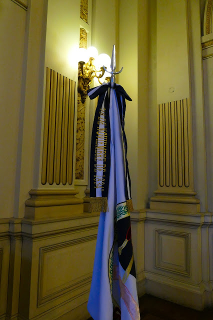 Giobierno館內只有一個女接待員.她只懂西班牙語無法幫我們講解.後來有一位負責旅遊的男仕和我們講解.這間建築物是政府建築物,建築風格是法國學院派的設計,建築物呈長方形,中間有一個大庭園,格局有點兒似香港大學.它主要開放了旗廳給公衆參觀.旗廳放了阿根廷23個省及一個聯邦首都區的旗幟.在大堂中間是橢圓型國徽.圍繞它寫上先知以賽亞的詞句-主的恩典帶來愉快的花蜜和神聖的智慧.在國徵兩旁擺放了國旗及省旗.這裏放有