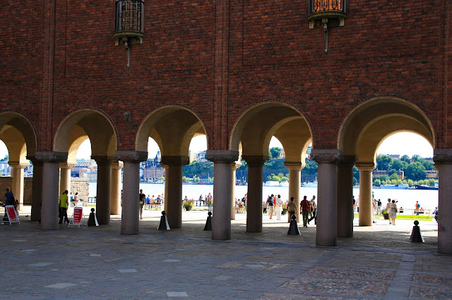 2015年8月12日參觀完我們去一間好有特色的岩洞餐廳吃瑞典肉丸餐,有點兒像宜家的瑞典肉丸.吃完午餐我們便去參觀今天的重點,每年頒發諾貝爾奬的市政廳.市政廳位於孔斯爾緬(Kungsholmen)島上.它於1911年動工至1923年6月完工.整個建築物採用義大利文藝復興風格,市政廳右側高105公尺的方柱形塔樓,塔頂上有瑞典的國徽的三個皇冠,象徵1337年後的三位偉大君王.